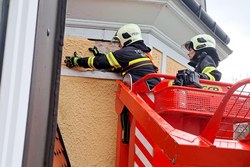 Wir fuhren mit dem Kran zur Schadenstelle, entfernten die losen Teile und begutachtenden die Fassade auf etwaige weitere Gefahrenquellen.