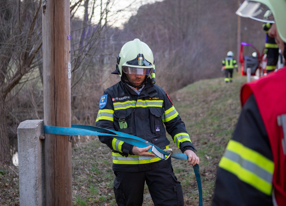 Als wir wenig später die Einsatzstelle erreichten, war die Polizei bereits vor Ort und ein Masten der Telekom wurde bereits von einem vorbeikommenden Kameraden der FF Altenmarkt mit einem Zurrgurt gesichert.